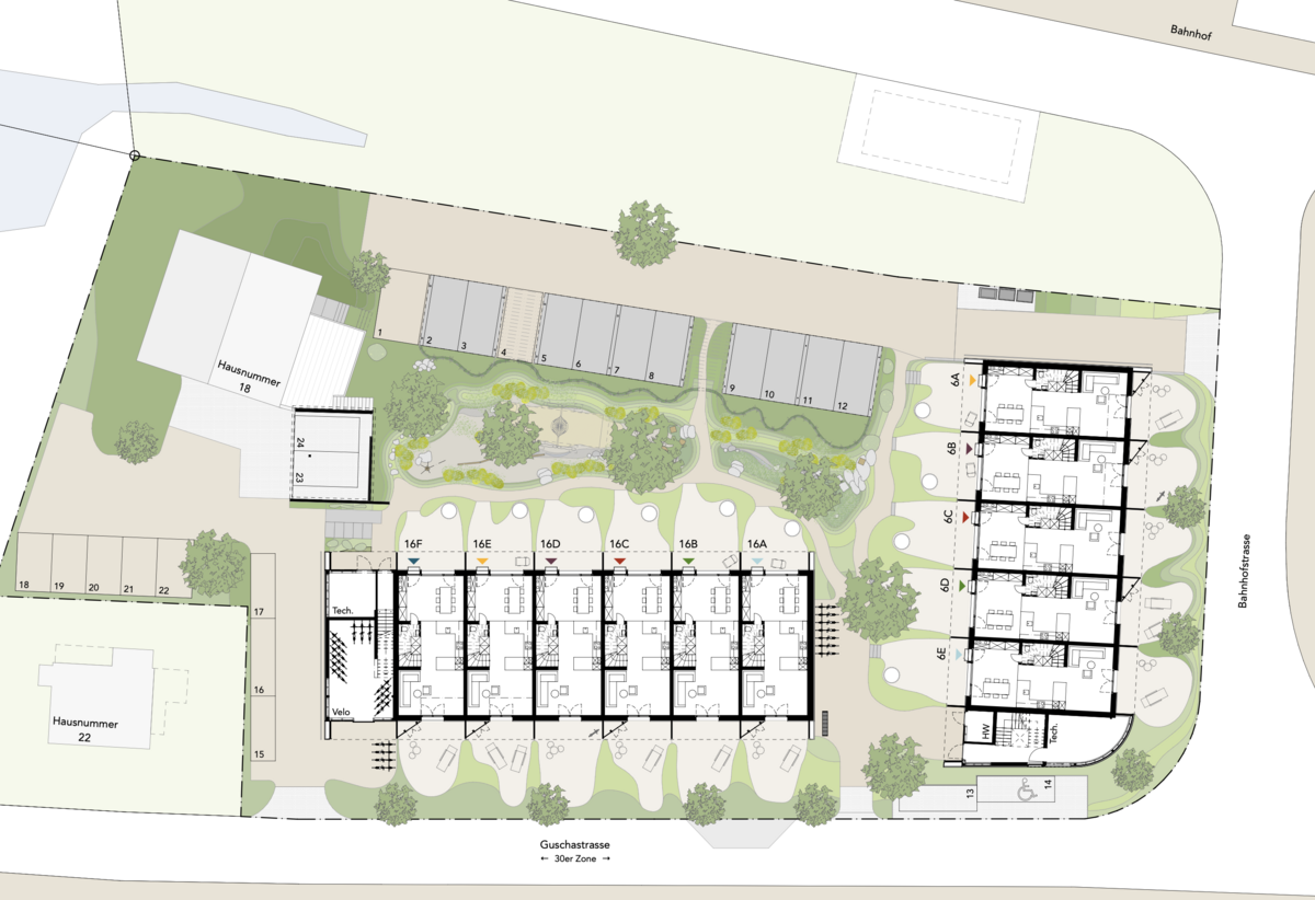 Die 6-Zimmer Miethäuser mit bis zu 160 m² Hauptnutzfläche, richten sich an berufstätige Paare oder Familien mit Kindern, welche die unmittelbare Nähe zur örtlichen Infrastruktur (Bahn, Bus, Schulen, KITA, Einkaufen, Autobahn A13) schätzen und in einem äusserst attraktiven Wohnquartier mit Grünpark leben wollen. Beim Entwurf wurde der Grünraum bewusst in die Architektur einbezogen. Je zwei Gartenzimmer und zwei Balkone ergänzen den eigenen 3-geschossigen Wohnbereich.